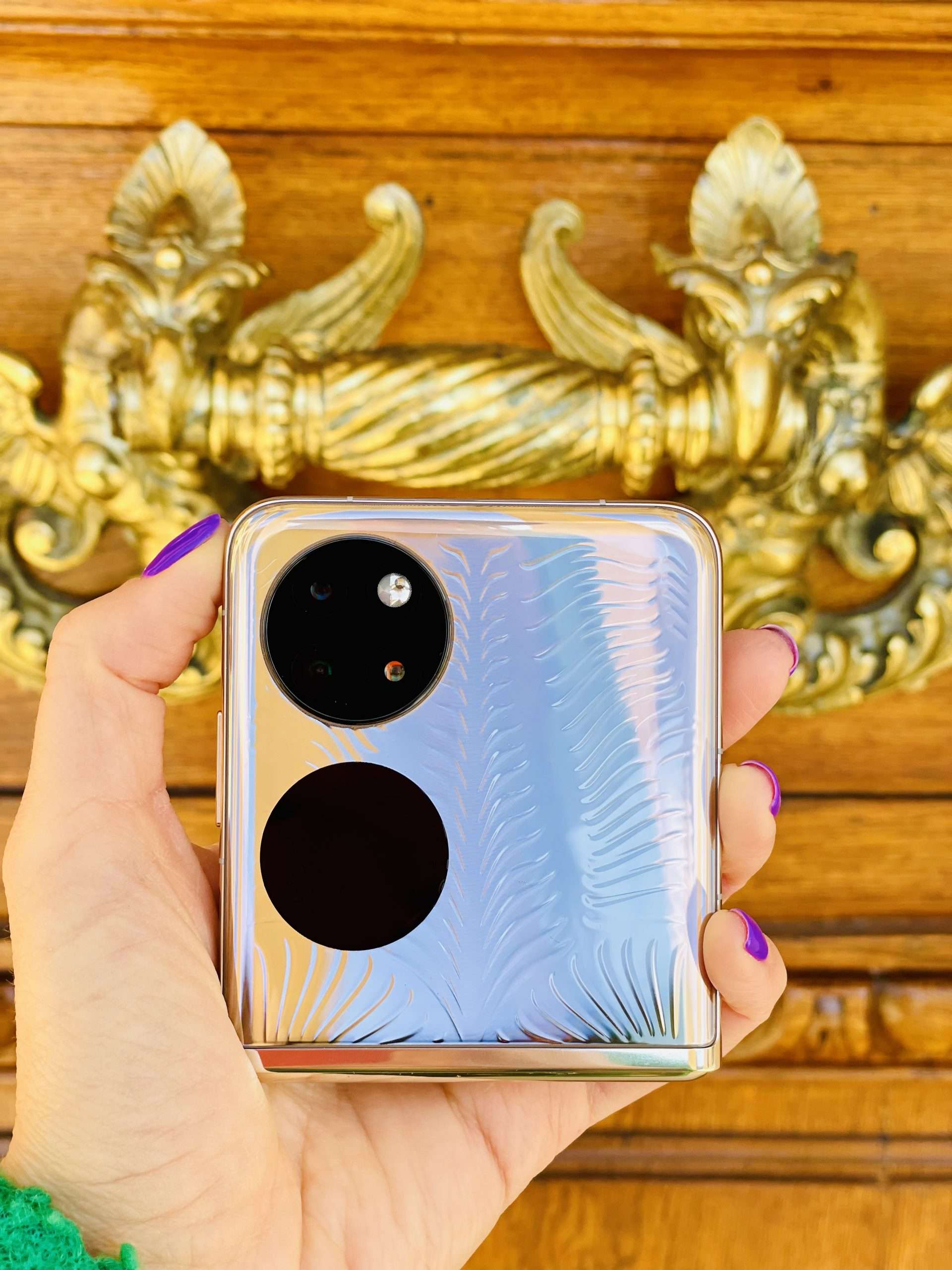 HUAWEI P50 Pocket strălucește la specificațiile tehnice dar ce atrage cel mai mult este look-ul glam. Este un telefon cu ecran pliabil de tip clamshell (cu clapetă), cu o carca